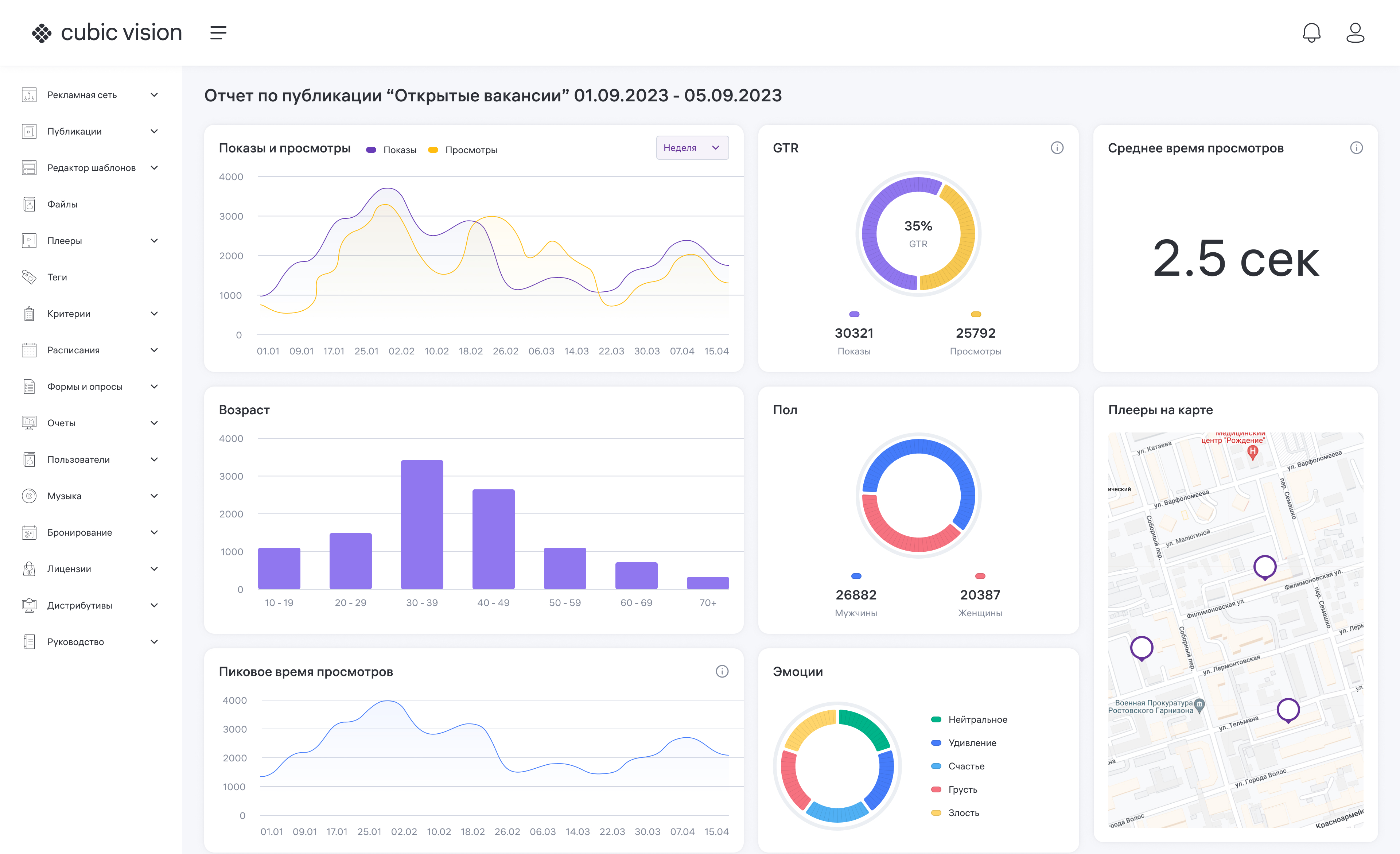 Этот отчет находится в блоке «Публикации» и содержит графическое отображение статистики показов публикаций. Отчет позволяет увидеть диаграммы со следующими данными: