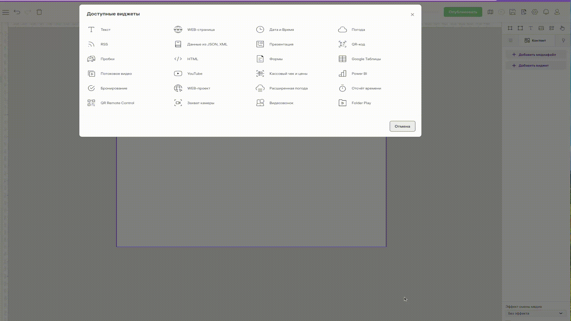 1. Чтобы добавить в шаблон виджет «QR-код», зайдите в редактор шаблонов. 2. Создайте или откройте шаблон. Виджет можно добавить прямо на сцену или создать для него отдельный контейнер. Поэтому выберите нужную сцену или создайте контейнер в сцене. 3. Во вкладке «Контент» в настройках сцены или контейнера нажмите на кнопку «Добавить виджет». Откроется окно со списком доступных виджетов. Выберите виджет «QR-код». Откроется окно с настройками виджета.