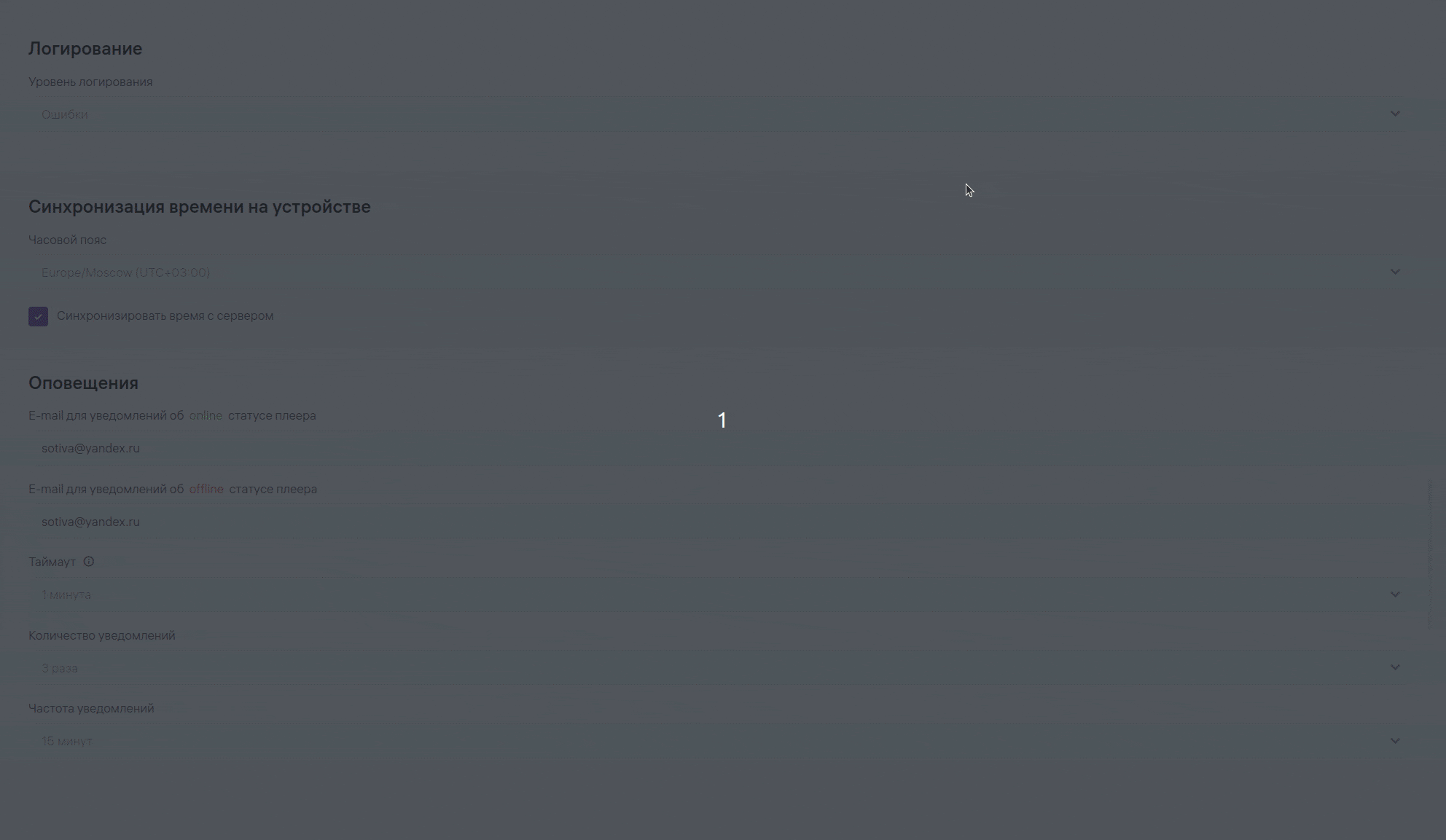 CMS может автоматически посылать оповещения о статусе плеера. Оповещения можно отправить на несколько адресов. Email для уведомления об online статусе плеера. Email для уведомления об offline статусе плеера. Таймаут — промежуток времени, в течение которого уведомления не будут отправляться. Например, если вы укажете время таймаута — 1 минута, то уведомление придет через одну минуту после смены статуса. Количество уведомлений — сколько раз должно прийти уведомление после смены статуса. Например, если вы укажете три раза, то на почту придет три уведомления. Частота уведомлений — промежуток времени, через который вы хотите получать повторные уведомления: 15 минут, 1 час, 1 день, 1 неделя. Например, если количество уведомлений — 3 раза, а частоту — 15 минут, то на почту придет 3 уведомления через 15 минут каждое. Email уведомлений о проблемных плеерах — укажите здесь список адресов, на которые вы хотите получать уведомления о проблемных плеерах.