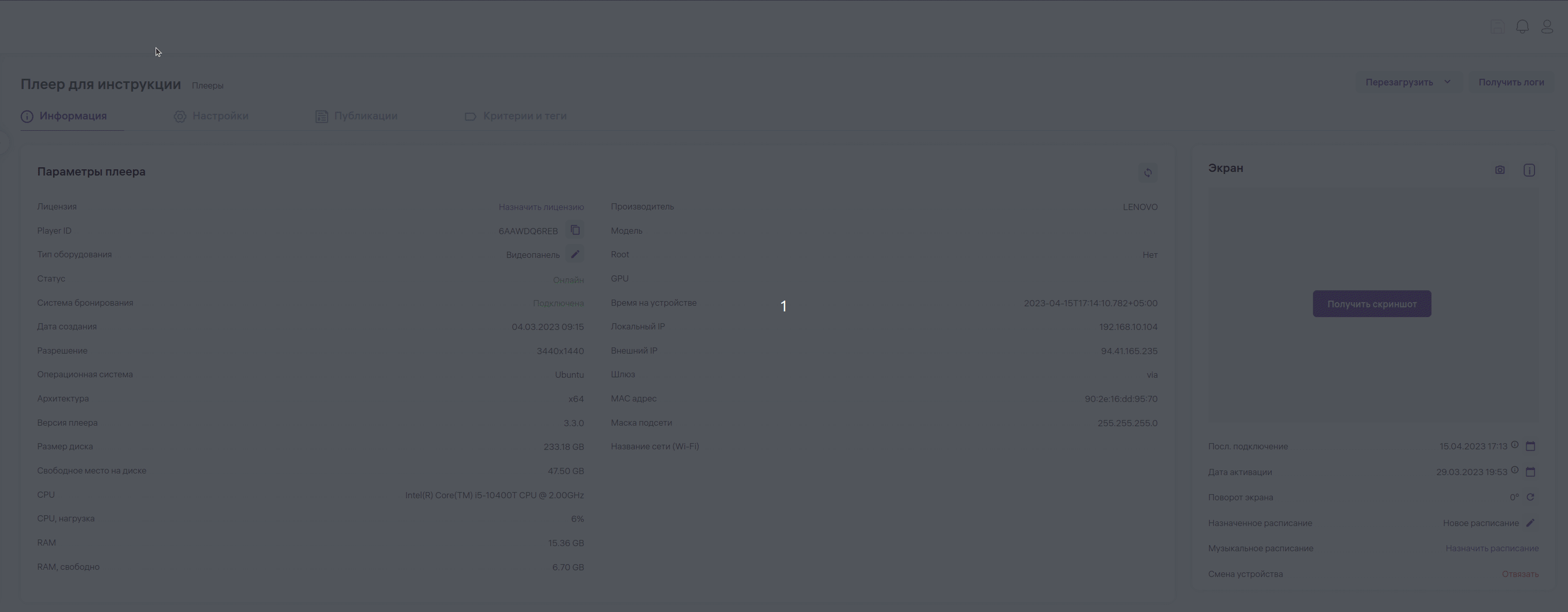 * Информация; * Настройки; * Публикации; * Критерии и теги. Также вы увидите две кнопки «Перезагрузить» и «Получить логи». С помощью кнопки «Перезагрузить» можно перезагрузить или плеер, или устройство. Если вы перезагрузите плеер — перезагрузится только приложение, а устройство не перезагрузится. При перезагрузке устройства — перезагрузится все устройство. Экраны с операционной системой Android можно перезагрузить по команде из CMS, если у вас есть root права. Если в качестве оборудования используется проф.панель ОС WebOS, то перезагружается только проф.панель. Кнопка «Получить логи» позволяет получить информацию о работе плеера. Например, если сработал какой-то триггер — это действие записывается в лог. Логи необходимы для технической поддержки Cubic Vision, чтобы найти причину проблемы.