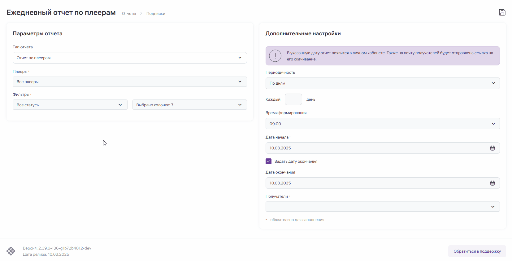 Также вы должны учитывать, что если при выборе плеера указать пункт «Все плееры», то отчет будет формироваться для всех плееров, существующих на момент формирования отчета, а не на момент создания подписки.