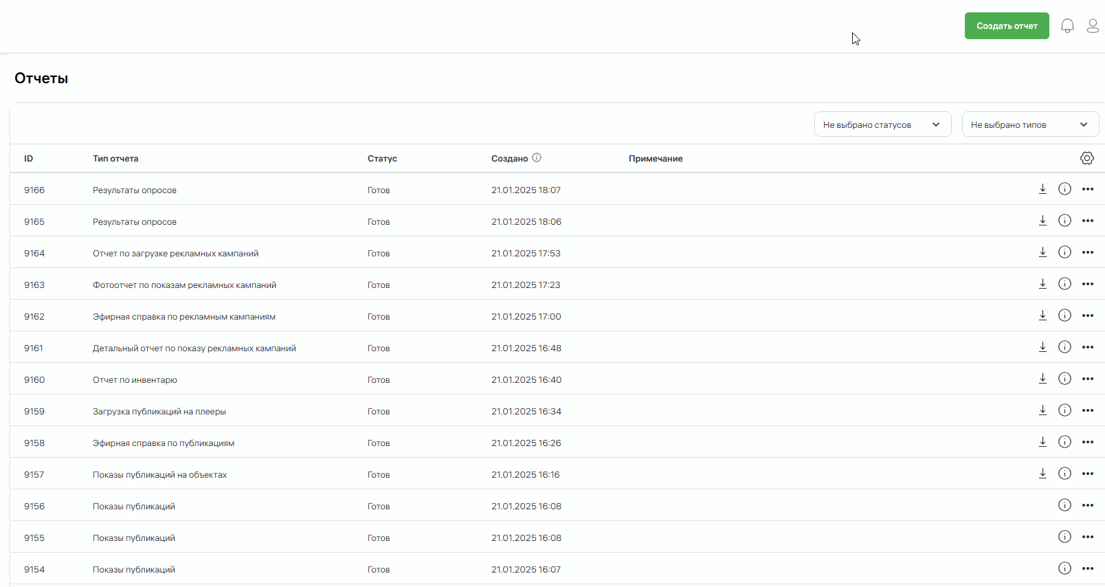 Отчет находится в блоке «Результаты взаимодействия» и позволяет получить информацию о результатах форм, полученных с плееров в заданном диапазоне времени. Отчет содержит информацию о дате, времени, плеере, имени формы, полях формы, предполагаемом поле и возрасте пользователей (при условии подключения модуля распознавания). 1. Нажмите на поле «Плееры». Откроется менеджер плееров. В нем вы можете выбрать плеер или группу плееров. 2. Нажмите на поле «Формы» и выберите форму. 3. В полях с начальной и конечной датой выберите необходимые даты. 4. Введите необходимую информацию в поле «Примечание». 5. Нажмите кнопку «Создать». Чтобы просмотреть отчет о результатах форм в браузере, нажмите на значок ![](attachments/%D0%A1%D0%BD%D0%B8%D0%BC%D0%BE%D0%BA%20%D1%8D%D0%BA%D1%80%D0%B0%D0%BD%D0%B0%20%D0%BE%D1%82%202023-11-20%2018-18-13.png) Появится меню. Выберите в нем пункт «Открыть в новой вкладке». В браузере откроется вкладка с результатами форм. Чтобы просмотреть отчет, нажмите на значок ![](attachments/%D0%A1%D0%BD%D0%B8%D0%BC%D0%BE%D0%BA%20%D1%8D%D0%BA%D1%80%D0%B0%D0%BD%D0%B0%20%D0%BE%D1%82%202023-11-20%2018-17-35.png). Файл отчета скачается на ваш компьютер. ![](attachments/14_%D0%A0%D0%B5%D0%B7%D1%83%D0%BB%D1%8C%D1%82%D0%B0%D1%82%D1%8B%20%D1%84%D0%BE%D1%80%D0%BC.gif)