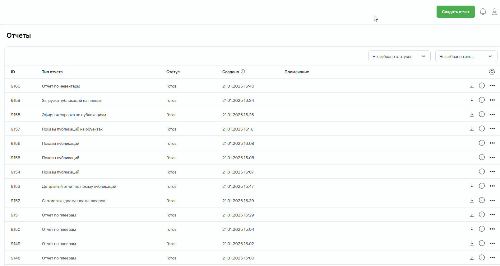 Этот отчет находится в блоке «Рекламные кампании» и содержит информацию о проигрывании рекламных кампаний на инвентаре. При необходимости вы можете отфильтровать таблицу по инвентарю, номерам объектов и медиафайлам, а так же временному диапазону. Отчет позволяет увидеть тип контрагента, название контрагента, ID рекламной кампании, название рекламной кампании, длительность, ID инвентаря, ID плеера, название плеера, номер объекта. 1. Нажмите на поле «Контрагент» и выберите контрагента. 2. Нажмите на поле «Рекламные кампании». Откроется окно, в котором вы можете выбрать рекламную кампанию. 3. Нажмите на поле «Инвентарь». Выберите либо «Весь инвентарь», либо «Выбрать инвентарь». 4. Нажмите на поле «Номер объекта», откроется поле для ввода номера объекта. Введите номер объекта каждый с новой строки. Или переключите чекбокс и выберите номер из списка. 5. Нажмите на поле «Медиафайлы». В менеджере медиафайлов найдите и выберите необходимые. 6. В полях с начальной и конечной датой выберите необходимые даты. 7. Выберите формат генерируемого файла. Выбор формата зависит от количества строк в отчете. При большом объеме данных рекомендуется использовать формат CSV для удобства работы, в то время как для меньшего количества строк можно выбрать формат XLSX. 8. Введите необходимую информацию в поле «Примечание». 9. Нажмите кнопку «Создать». Чтобы просмотреть отчет, нажмите на значок ![](attachments/%D0%A1%D0%BD%D0%B8%D0%BC%D0%BE%D0%BA%20%D1%8D%D0%BA%D1%80%D0%B0%D0%BD%D0%B0%20%D0%BE%D1%82%202023-11-20%2018-17-35.png). Файл отчета скачается на ваш компьютер. ![](attachments/09_%D0%94%D0%B5%D1%82%D0%B0%D0%BB%D1%8C%D0%BD%D1%8B%D0%B9%20%D0%BE%D1%82%D1%87%D0%B5%D1%82%20%D0%BF%D0%BE%20%D0%BF%D0%BE%D0%BA%D0%B0%D0%B7%D1%83%20%D1%80%D0%B5%D0%BA%D0%BB%D0%B0%D0%BC%D0%BD%D1%8B%D1%85%20%D0%BA%D0%B0%D0%BC%D0%BF%D0%B0%D0%BD%D0%B8%D0%B9.gif)