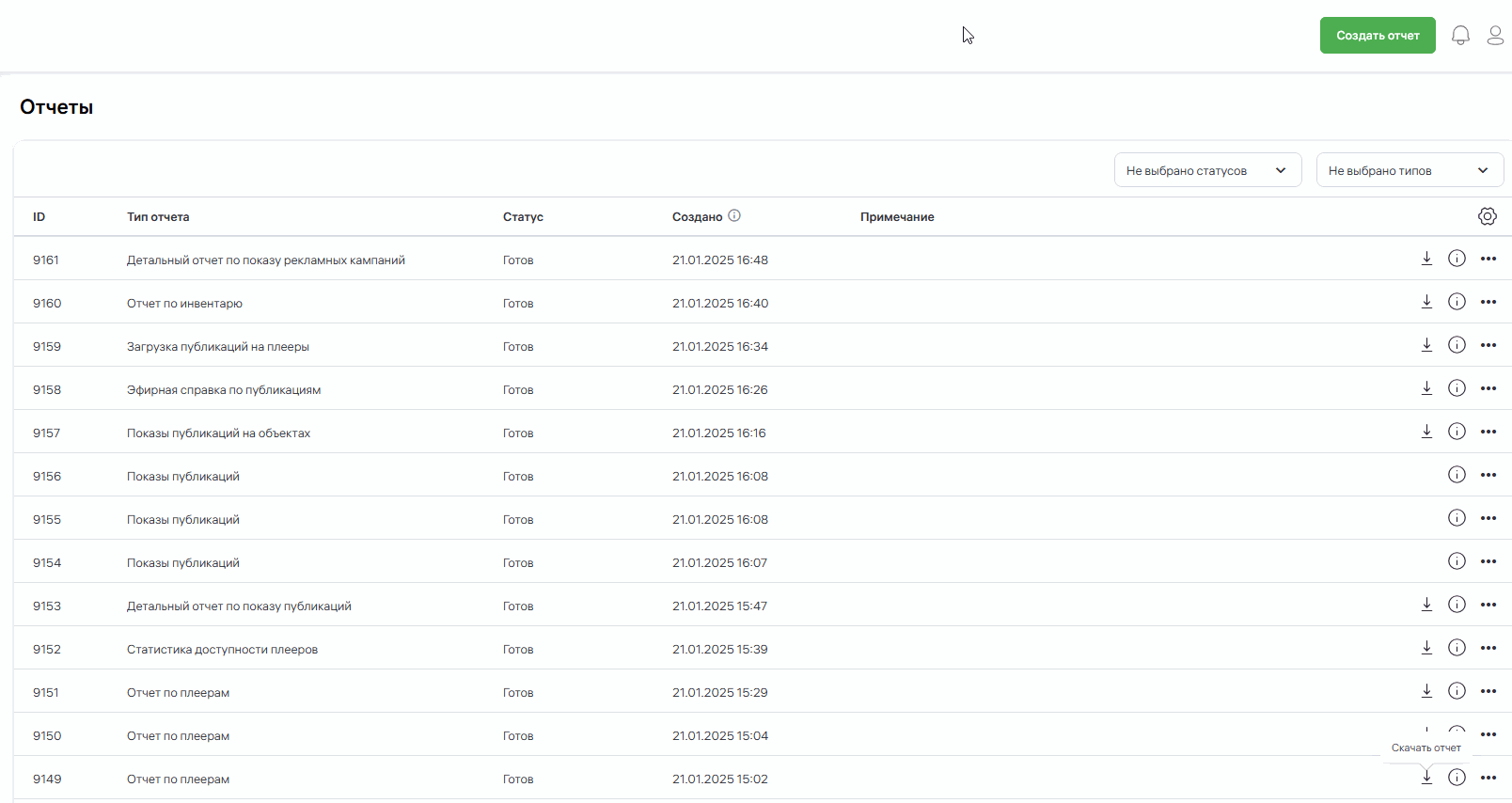 Этот отчет находится в блоке «Рекламные кампании» и содержит информацию по всем файлам из рекламных кампаний, которые были проиграны на инвентаре. Отчет позволяет увидеть дату, время, название контрагента, ID рекламной кампании, название рекламной кампании, категорию рекламной кампании, ID медиа, медиа, длительность медиа, название инвентаря, номер объекта и количество проигрываний. 1. Нажмите на поле «Контрагент» и выберите контрагента. 2. Нажмите на поле «Рекламные кампании». Откроется окно, в котором вы можете выбрать рекламную кампанию. 3. Нажмите на поле «Инвентарь». Выберите либо «Весь инвентарь», либо «Выбрать инвентарь». 4. Если вы выбрали опцию «Выбрать инвентарь», откроется менеджер инвентаря. Выберите в нем нужный инвентарь. 5. Нажмите на поле «Номера объектов», откроется поле для ввода номера объекта. Введите номер объекта каждый с новой строки. Или переключите чекбокс и выберите номера из списка. 6. В полях с начальной и конечной датой выберите необходимые даты. 7. Введите необходимую информацию в поле «Примечание». 8. Нажмите кнопку «Создать». Чтобы просмотреть отчет, нажмите на значок ![](attachments/%D0%A1%D0%BD%D0%B8%D0%BC%D0%BE%D0%BA%20%D1%8D%D0%BA%D1%80%D0%B0%D0%BD%D0%B0%20%D0%BE%D1%82%202023-11-20%2018-17-35.png). Файл отчета скачается на ваш компьютер. ![](attachments/10_%D0%AD%D1%84%D0%B8%D1%80%D0%BD%D0%B0%D1%8F%20%D1%81%D0%BF%D1%80%D0%B0%D0%B2%D0%BA%D0%B0%20%D0%BF%D0%BE%20%D1%80%D0%B5%D0%BA%D0%BB%D0%B0%D0%BC%D0%BD%D1%8B%D0%BC%20%D0%BA%D0%B0%D0%BC%D0%BF%D0%B0%D0%BD%D0%B8%D1%8F%D0%BC.gif)