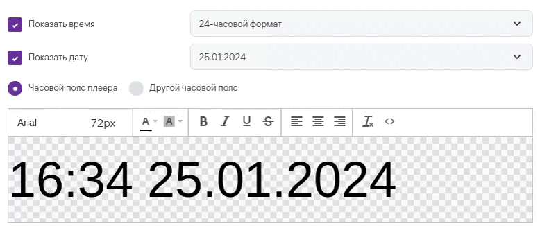 В редакторе в качестве примера для редактирования отображается дата и время пользователя, если выбрано «Время плеера». Если выбрали другой часовой пояс, то будет отображаться время этого часового пояса. Его нельзя менять вручную в самом редакторе.