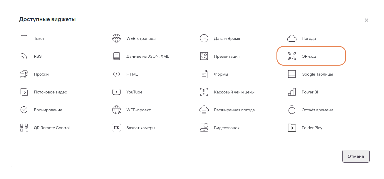 3. Во вкладке «Контент» в настройках сцены или контейнера нажмите на кнопку «Добавить виджет». Откроется окно со списком доступных виджетов. Выберите виджет «QR-код». Откроется окно с настройками виджета.