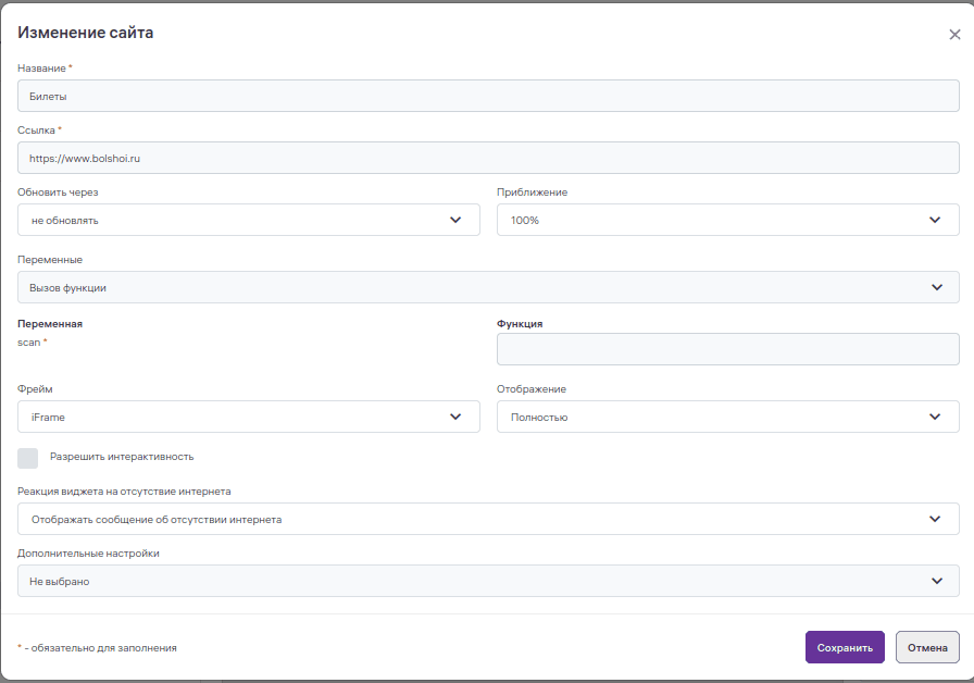 Заполнение полей «Название», «Ссылка», «Обновление» виджета «Web-страница»