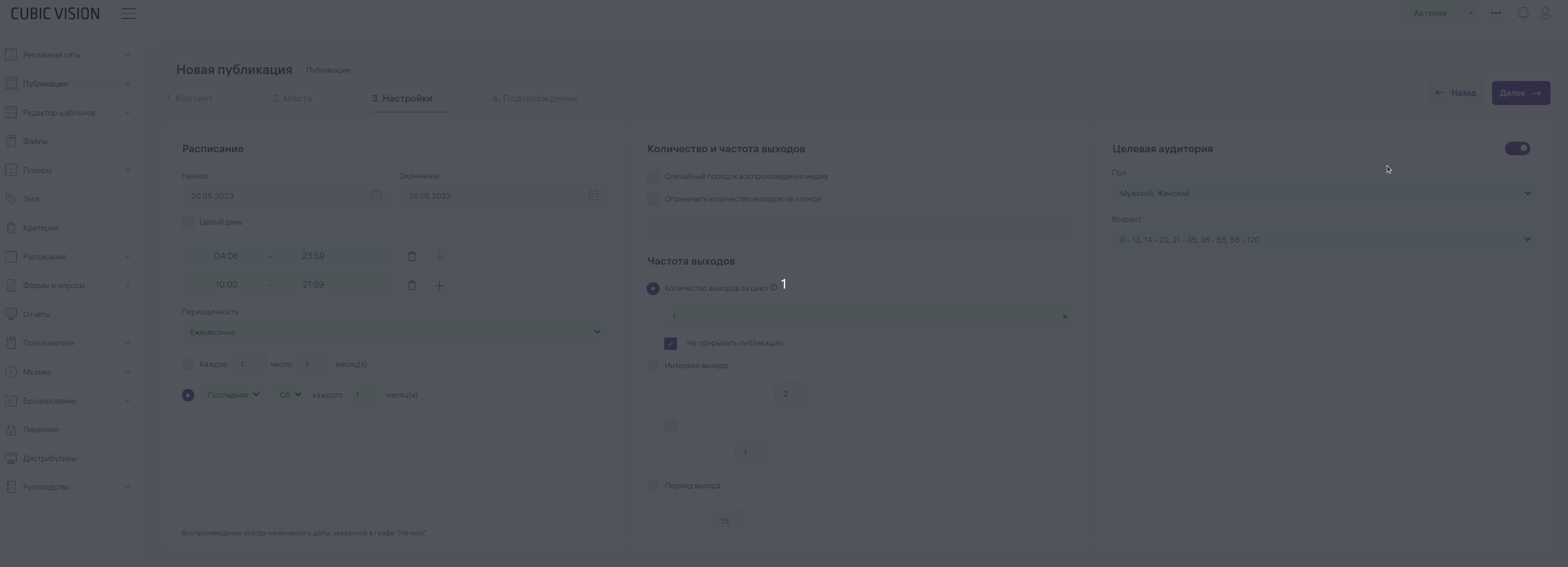 В данной вкладке можно настроить частоту выхода публикации и целевую аудиторию
