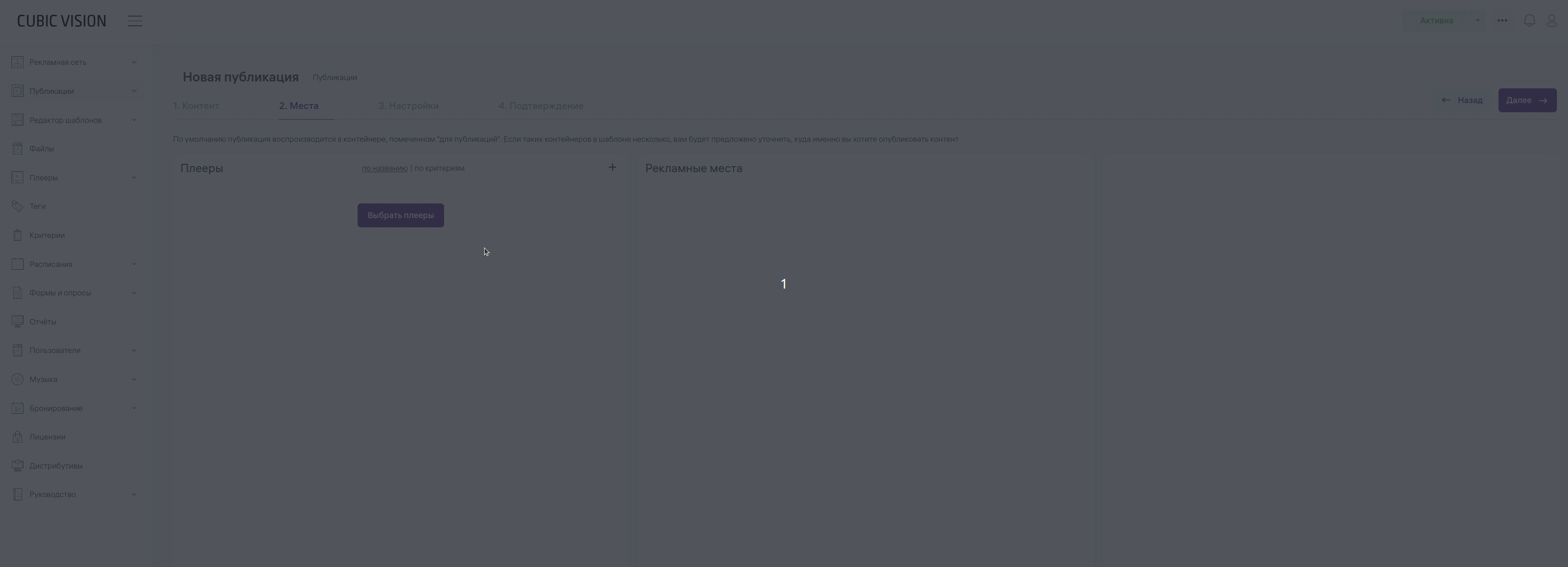 * Количество мест — это количество пар «Плеер + рекламное место». Обычно количество мест равно количеству плееров, которые будут воспроизводить публикацию. Но могут быть и другие варианты. Например, публикация назначена на четыре плеера, но при этом у 1 плеера нет в шаблоне рекламного места, а у второго и третьего плееров по 2 выбранных рекламных места, то количество рекламных мест будет 5.