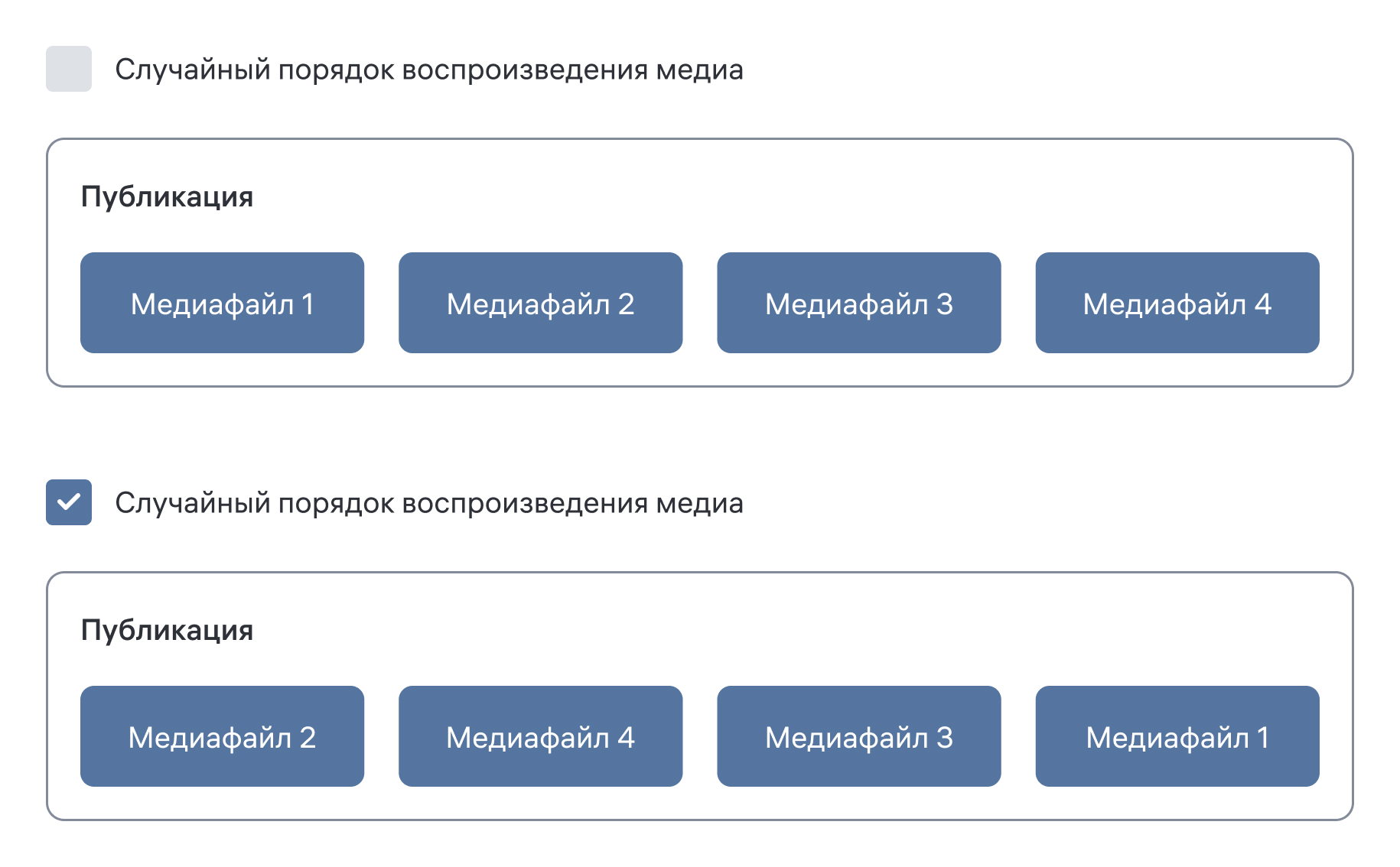 Например, в публикации 4 медиафайла и они будут воспроизводиться не по очереди Медиафайл 1—Медиафайл 2—Медиафайл 3—Медиафайл 4, а в случайном порядке: