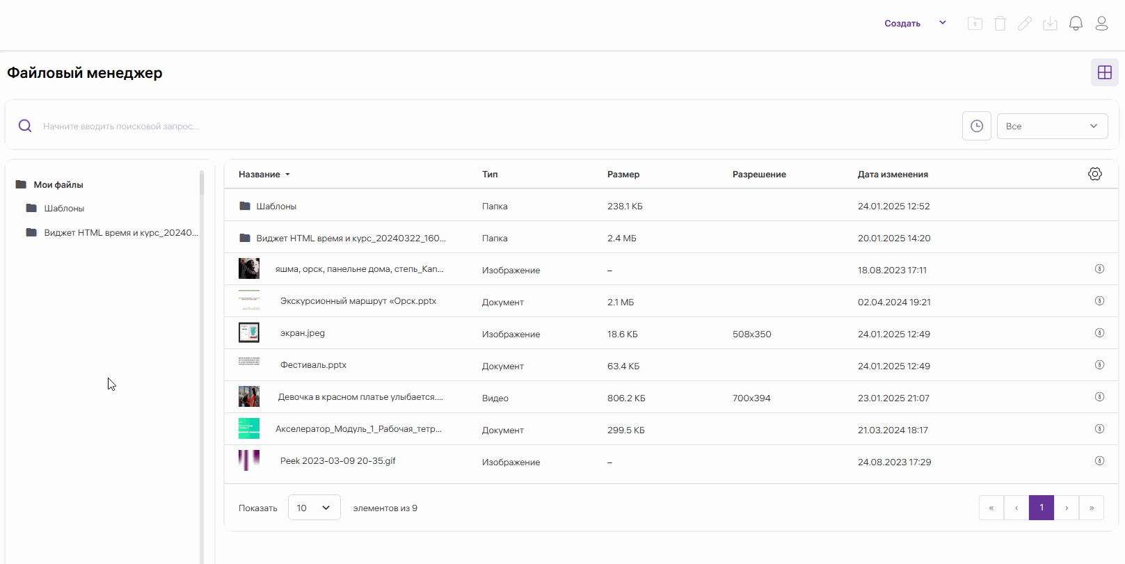 1. Для добавления нового файла выберите в каталоге папку, в которую будет добавлен новый файл, нажмите на кнопку «Создать» и выберите «Загрузить файл».