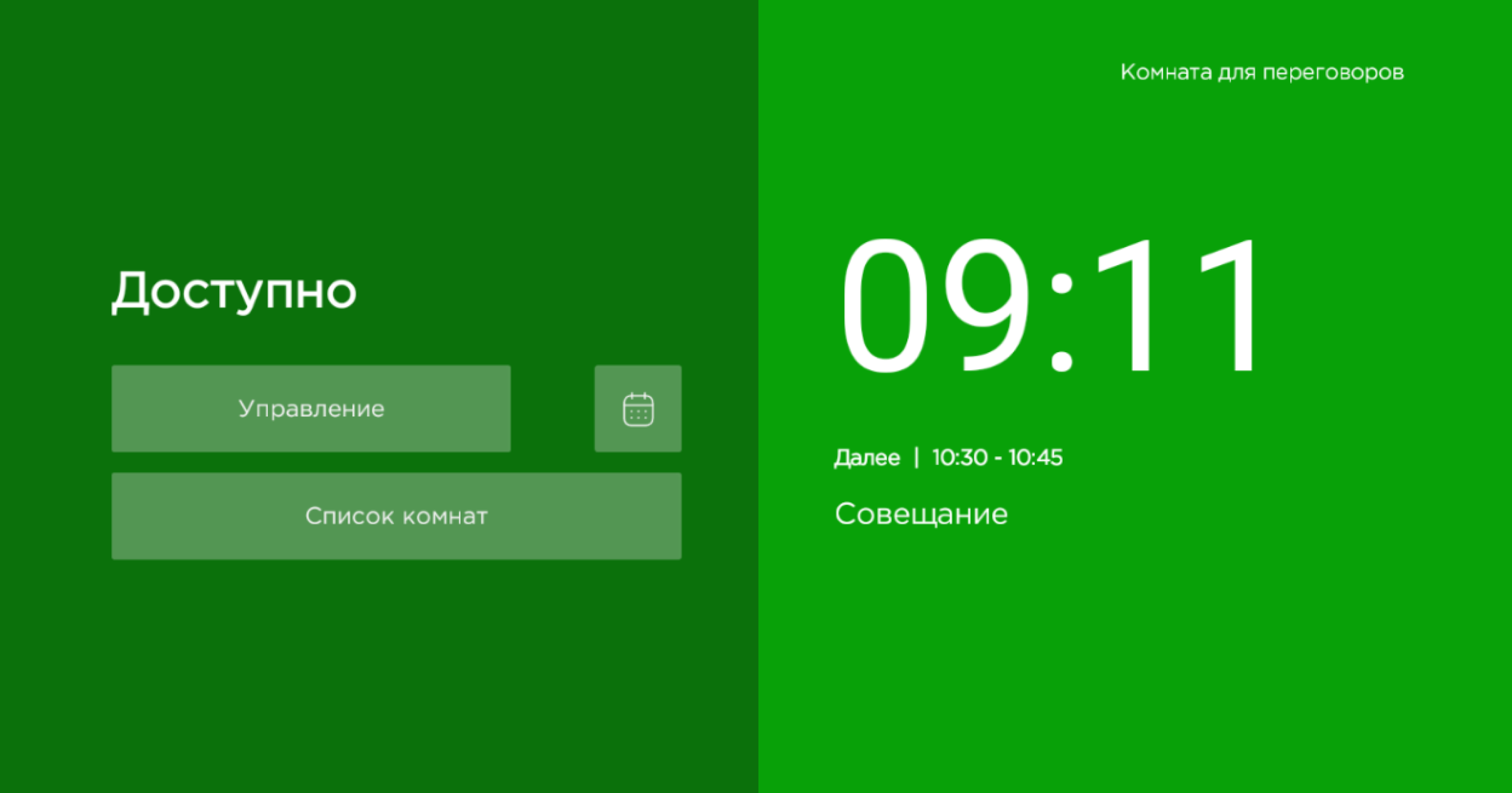 Левая половина содержит отображение текущего события и/или состояние комнаты (свободна, занята и скоро будет занята), а также кнопки управления событиями и просмотра календаря. Правая половина отображает время, название комнаты и последующие события. Подробнее о работе с виджетом на плеере смотрите раздел «[Как работать с системой бронирования на плеере](https://help-vision.cubicservice.ru/article/106-2448)».
