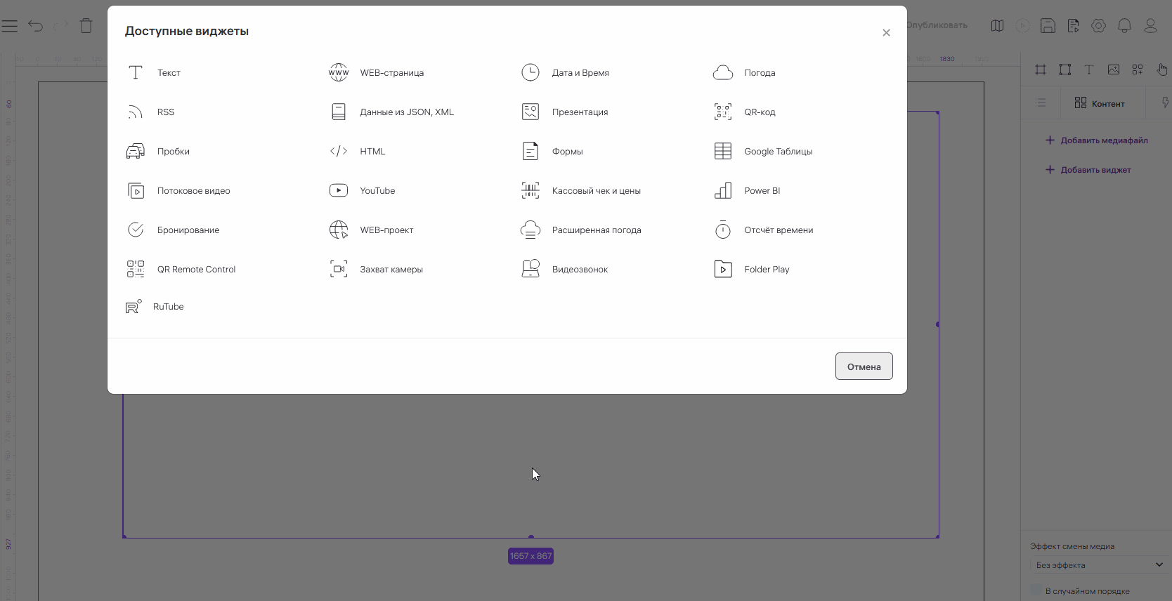 3. На вкладке «Контент» в настройках сцены или контейнера нажмите на кнопку «Добавить виджет». Откроется окно со списком доступных виджетов. Выберите виджет «Бронирование». Откроется окно с настройками виджета.