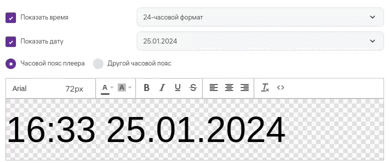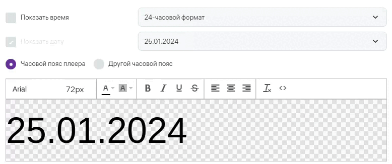 В редакторе в качестве примера для редактирования отображается дата и время пользователя, если выбрано «Время плеера». Если выбрали другой часовой пояс, то будет отображаться время этого часового пояса. Его нельзя менять вручную в самом редакторе.