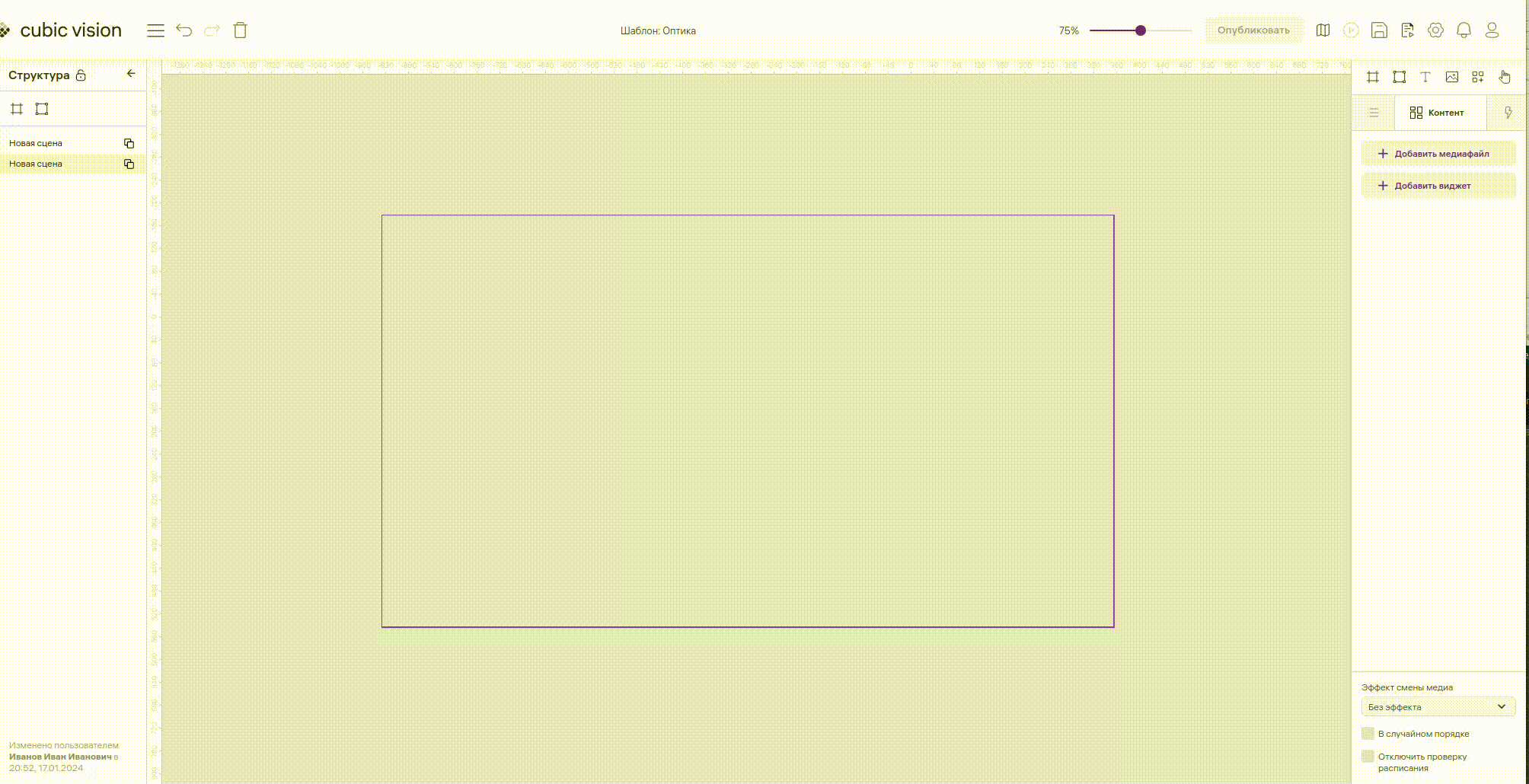 2. Создайте или откройте шаблон. Виджет можно добавить прямо на сцену или создать для него отдельный контейнер. Поэтому выберите нужную сцену или создайте контейнер в сцене.