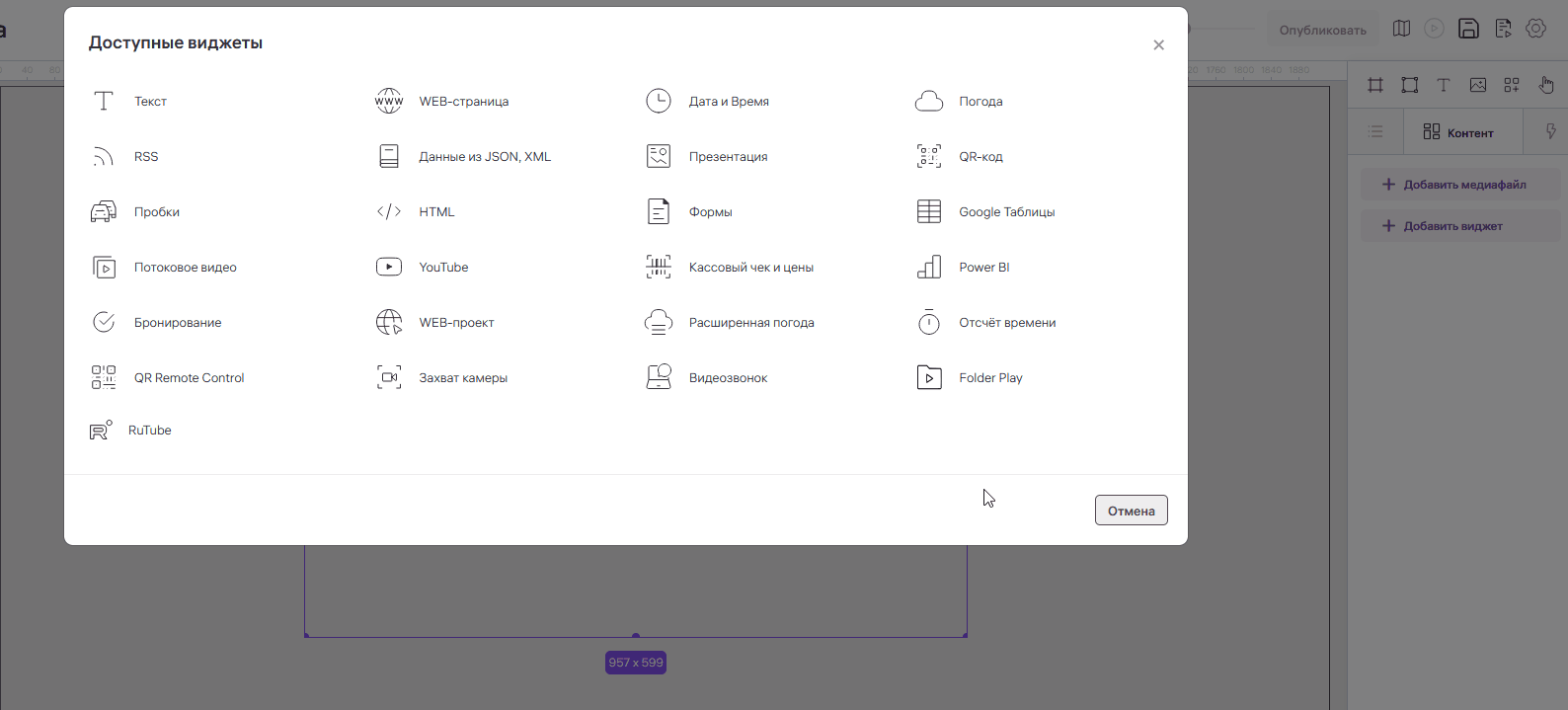 3. Во вкладке «Контент» в настройках сцены или контейнера нажмите на кнопку «Добавить виджет». Откроется окно со списком доступных виджетов. Выберите виджет «Потоковое видео». Откроется окно с настройками виджета.