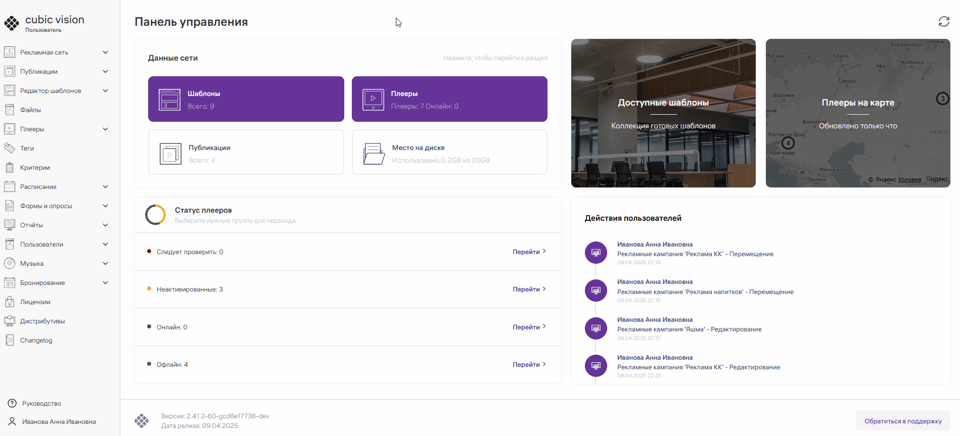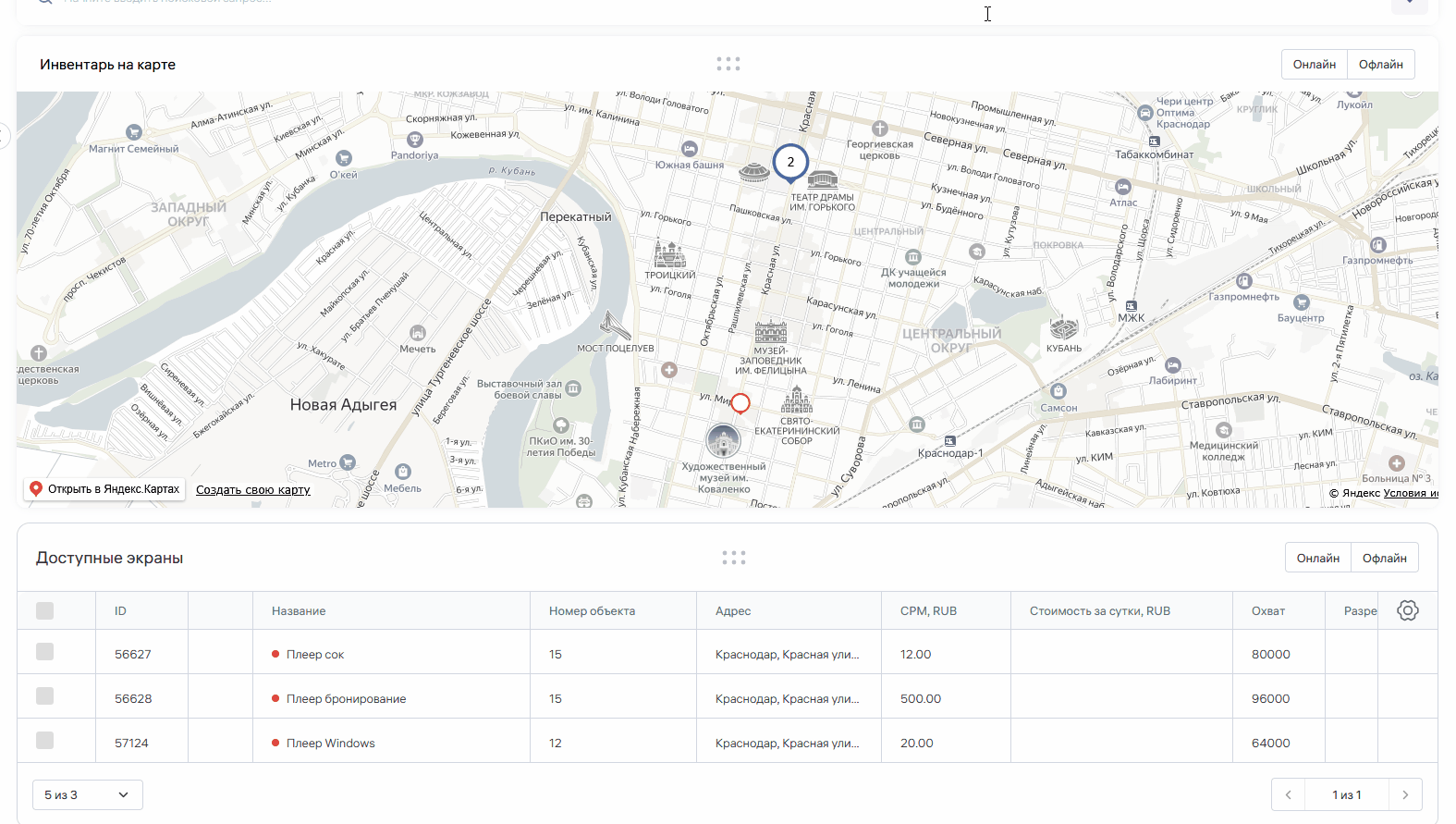 ## Инвентарь на карте Показывает географическое место размещения инвентаря и зависит от адреса, который вы указали при создании инвентаря. Вы можете поменять местами блоки «Инвентарь на карте» и «Доступные экраны», перетащив за значок ![](attachments/%D0%A2%D0%BE%D1%87%D0%BA%D0%B8%20%D0%BF%D0%B5%D1%80%D0%B5%D0%BC%D0%B5%D1%89%D0%B5%D0%BD%D0%B8%D0%B5.jpg). ## Доступные экраны В блоке отображается информация, введенная вами при настройке инвентаря в разделе «[Инвентарь](https://help-vision.cubicservice.ru/article/106-757)»: * Название инвентаря; * Номер объекта: задается при создании плеера; * Адрес; * Стоимость в CPM или стоимость за сутки; * Охват; * Разрешение; * Ориентация; * Количество слотов.