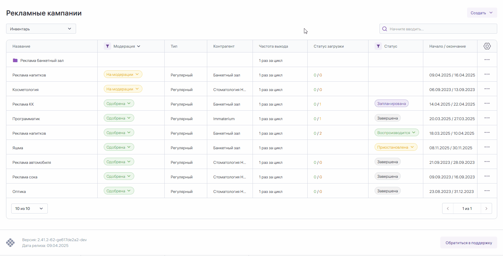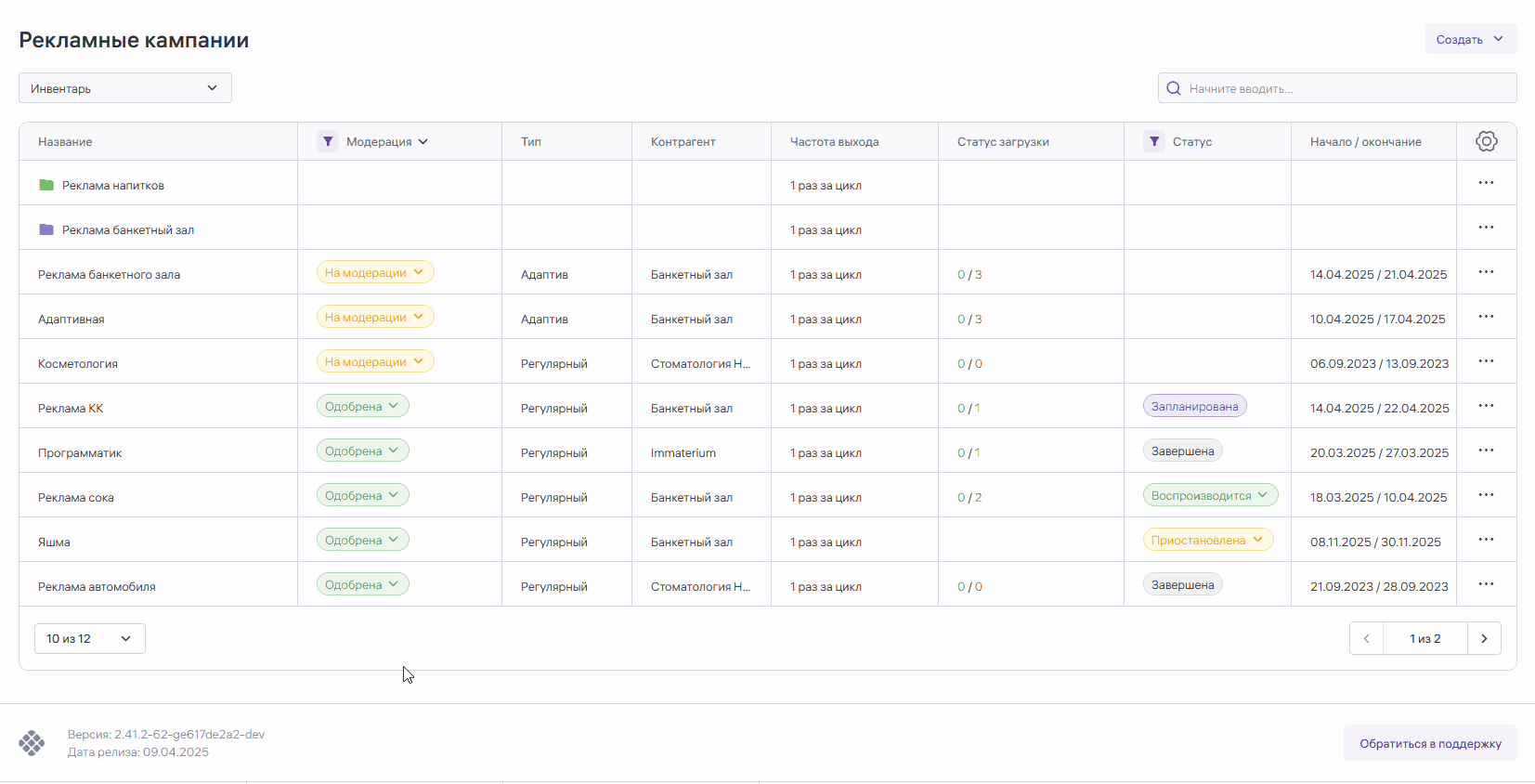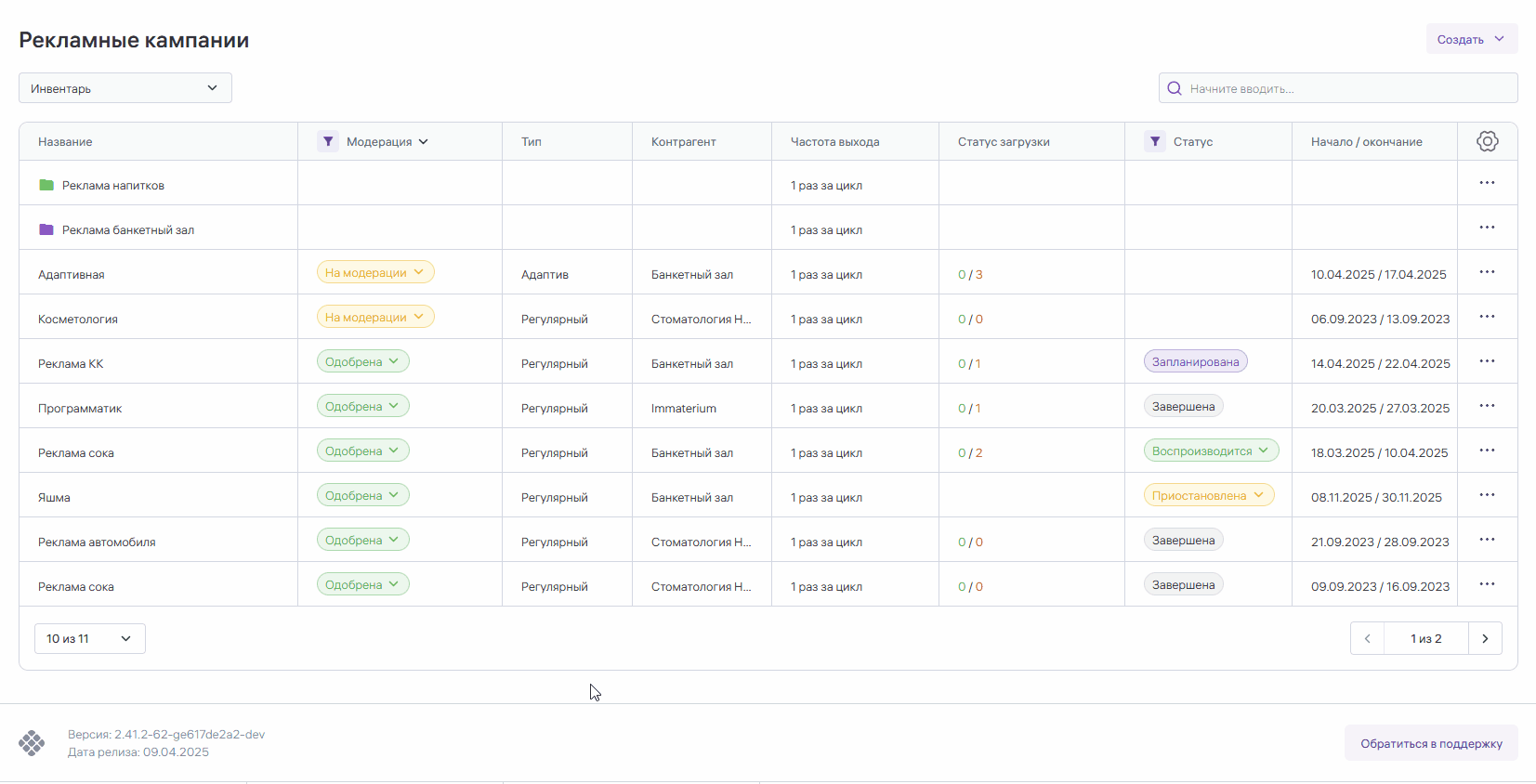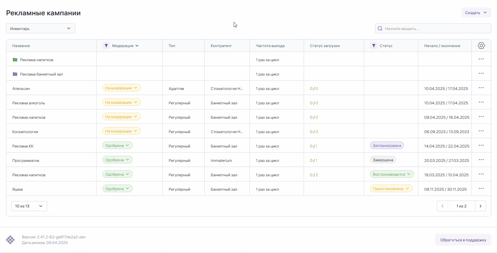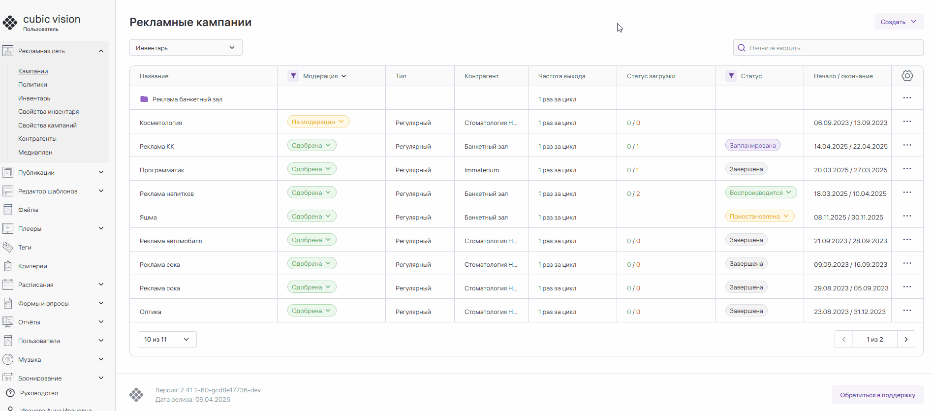 Для эффективного управления показами рекламы на экранах вашей сети используйте рекламные кампании. С их помощью вы можете: * Планировать и запускать рекламу; * Контролировать контент; * Управлять охватом аудитории; * Анализировать эффективность; * Оптимизировать бюджет. Таким образом, рекламные кампании помогают максимально результативно использовать ваши экраны, настроить целевой показ рекламы и получать аналитику для дальнейшей оптимизации. Чтобы зайти в панель управления рекламными кампаниями, выберите раздел «Кампании» в разделе «Рекламная сеть» главного меню. Откроется страница со списком всех ваших созданных кампаний. Здесь вы можете создать новую или изменить имеющуюся кампанию. Если вы создаете кампанию впервые, то список будет пустым. Вы можете отфильтровать список ваших рекламных кампаний по инвентарю, на который назначена ваша рекламная кампания. Для этого нажмите на фильтр «Инвентарь», в открывшемся окне укажите нужный инвентарь и нажмите кнопку «Ок». В списке отобразятся только рекламные кампании, где используется выбранный инвентарь. Для удобства, можно также использовать фильтры в шапке таблицы: **статус модерации** и **статус воспроизведения рекламной кампании**. Вы можете использовать оба фильтра одновременно. Вот как это работает: 1. Нажмите на кнопку ![](attachments/%D0%92%D0%BE%D1%80%D0%BE%D0%BD%D0%BA%D0%B0.jpg) в столбце «Модерация» или «Статус». 2. Выберите один или несколько нужных вариантов. 3. Таблица автоматически покажет только те кампании, которые соответствуют выбранному статусу. ![](attachments/%D0%A0%D0%B5%D0%BA%D0%BB%D0%B0%D0%BC%D0%BD%D0%B0%D1%8F%20%D0%BA%D0%B0%D0%BC%D0%BF%D0%B0%D0%BD%D0%B8%D1%8F%20%D0%BD%D0%B0%D1%87%D0%B0%D0%BB%D0%BE.gif)