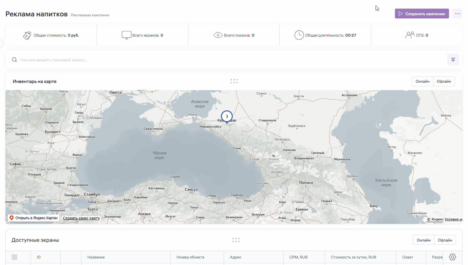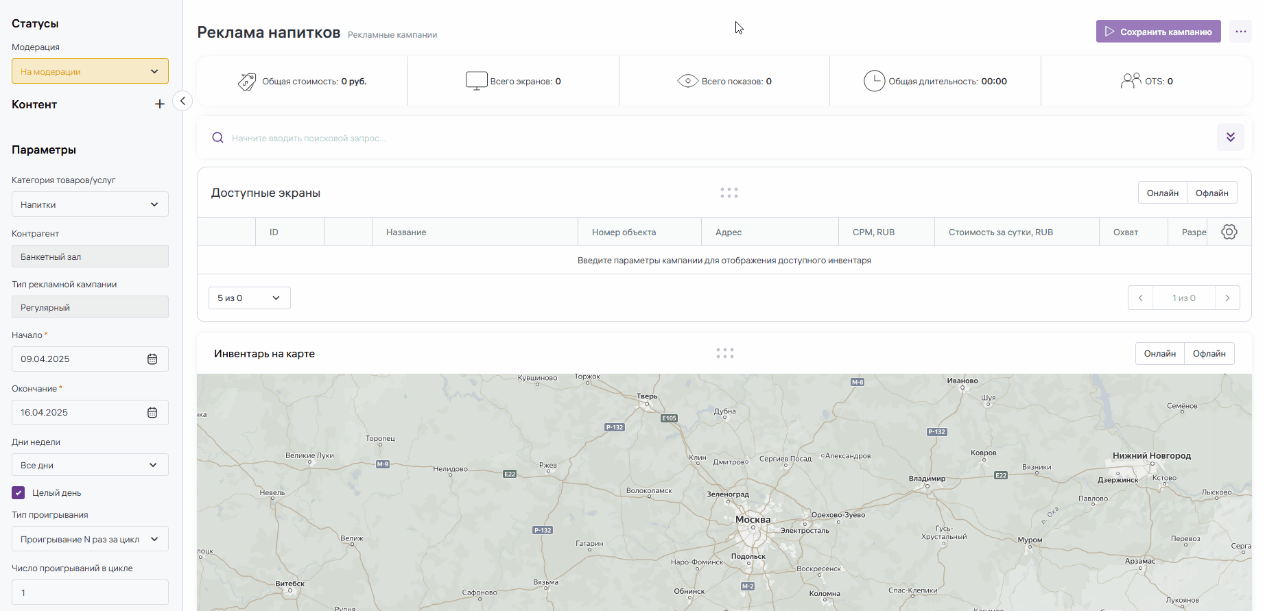 ## Итоговая информация о кампании После выбора доступного инвентаря в разделе «Доступные экраны» отображается итоговая информация о кампании. Если в этом разделе вы не выбрали ни одного экрана, часть полей будут пустыми. * Общая стоимость; * Всего экранов; * Всего показов; * Общая длительность; * OTS - количество контактов, полученных в ходе рекламной кампании. Для сохранения параметров рекламной кампании нажмите на кнопку «Сохранить кампанию». ![](attachments/%D0%A0%D0%B5%D0%BA%D0%BB%D0%B0%D0%BC%D0%BD%D0%B0%D1%8F%20%D0%BA%D0%B0%D0%BC%D0%BF%D0%B0%D0%BD%D0%B8%D1%8F%20%D0%B8%D1%82%D0%BE%D0%B3.gif)