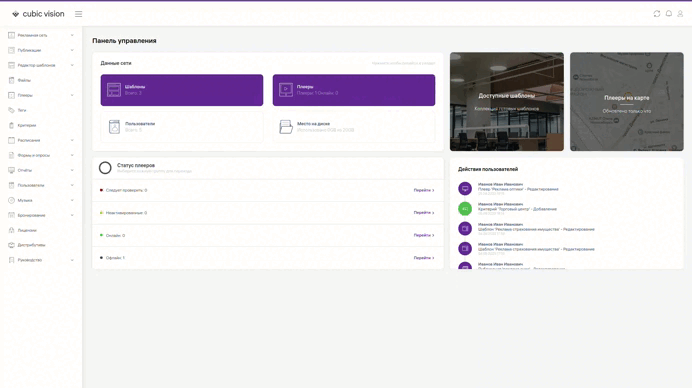 4. Создать кампанию. В разделе «Рекламная сеть» главного меню выберите пункт «Кампании». С помощью кнопки «Создать» создайте кампанию. В разделе «Статусы» рядом с заголовком «Контент» нажмите значок «\+». В файловом менеджере выберите рекламное медиа. Подробнее о работе с файловым менеджером в разделе «[Файловый менеджер](https://help-vision.cubicservice.ru/section/106-2297)». В разделе «Параметры» выберите категорию товаров и услуг. Введите дату начала и окончания рекламной кампании. Укажите нужную вам ориентацию и разрешение. Настройки и ограничения проигрывания оставьте по умолчанию. Нажмите кнопку «Применить». Далее выберите свой инвентарь из списка инвентарей справа. Подробнее о создании кампании в разделе «[Рекламные кампании]( данного руководства. Нажмите на кнопку «Сохранить кампанию». ![](attachments/%D1%80%D0%B5%D0%BA%D0%BB%D0%B0%D0%BC%D0%BD%D1%8B%D0%B5%20%D0%BA%D0%B0%D0%BC%D0%BF%D0%B0%D0%BD%D0%B8%D0%B8.gif)