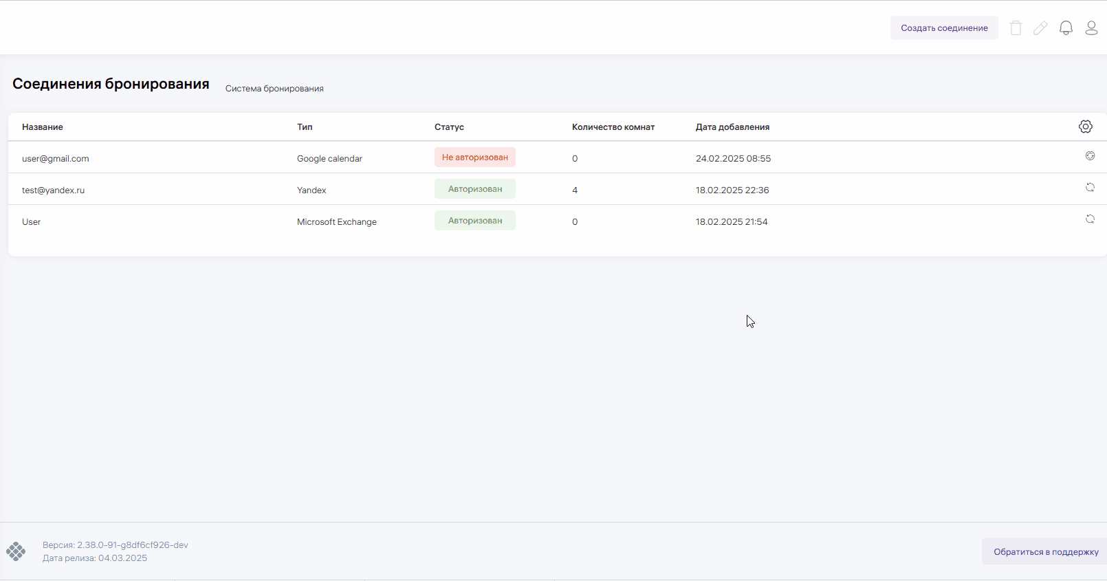 ## Как создать новое соединение Для создания нового соединения зайдите в раздел «Бронирование» и выберите пункт «Соединения». Откроется страница со списком всех подключенных соединений. Здесь вы можете создать новое, изменить или удалить имеющееся соединение. Если вы создаете соединение впервые, то список будет пустым. Нажмите на кнопку «Создать соединение». Откроется окно выбора системы для работы с календарем. ![](attachments/%D0%91%D1%80%D0%BE%D0%BD%D0%B8%D1%80%D0%BE%D0%B2%D0%B0%D0%BD%D0%B8%D0%B5%20%D1%81%D0%BE%D0%B5%D0%B4%D0%B8%D0%BD%D0%B5%D0%BD%D0%B8%D1%8F%201.gif)