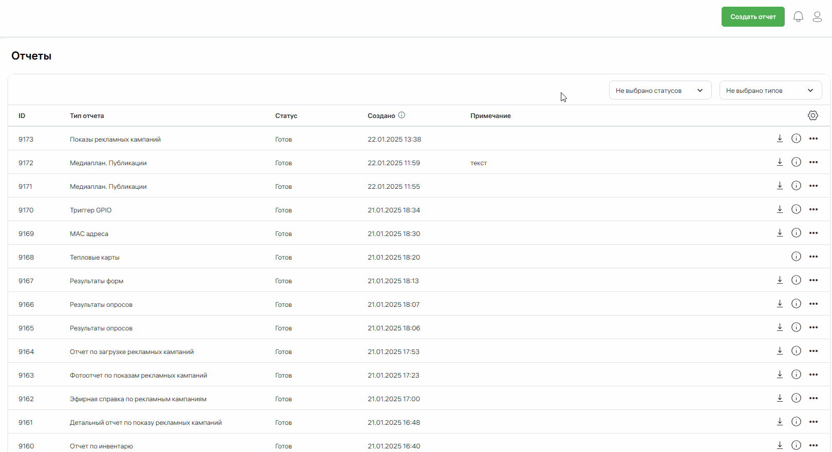 Чтобы просмотреть отчет, нажмите на значок . Файл отчета скачается на ваш компьютер. Изображение 1. Создание отчета «Медиаплан. Публикации»