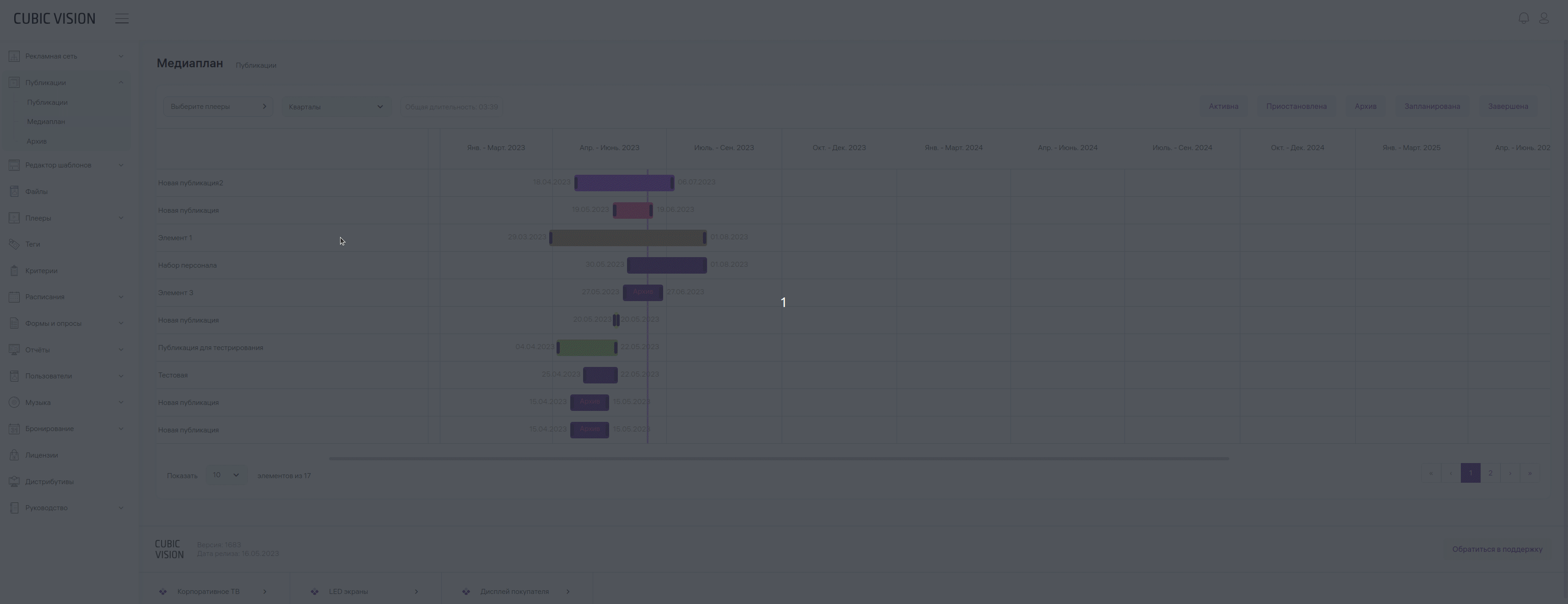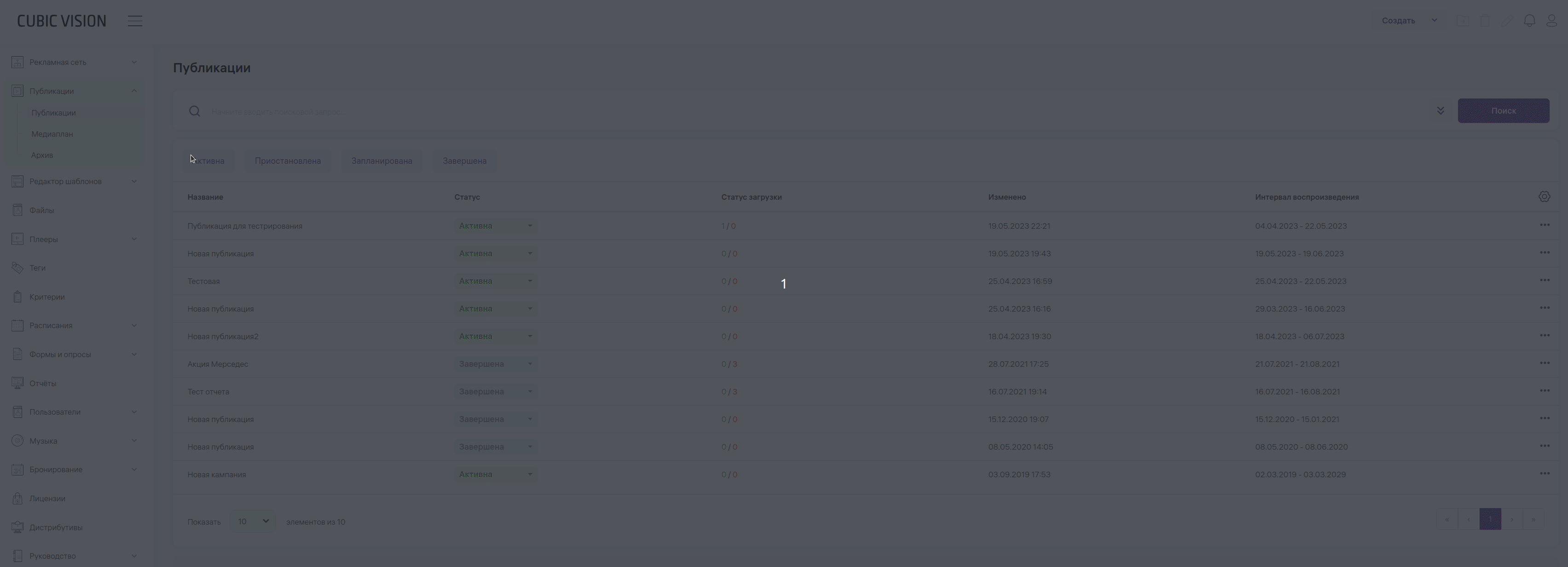 Чтобы открыть медиаплан, зайдите в раздел «‎Публикации» главного меню и выберите пункт «‎Медиаплан». Откроется окно, в котором вы можете работать со всеми вашими публикациями. Для удобства поиска нужных публикаций можно воспользоваться фильтрацией: * По плеерам; * По активности: активна, приостановлена, архив, запланирована, завершена.