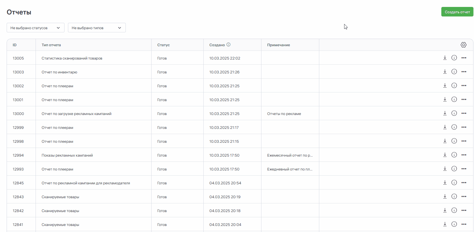 Если рекламная кампания не играла на плеере или играла менее 10 минут, то напротив названия отчета будет написано «Ошибка».
