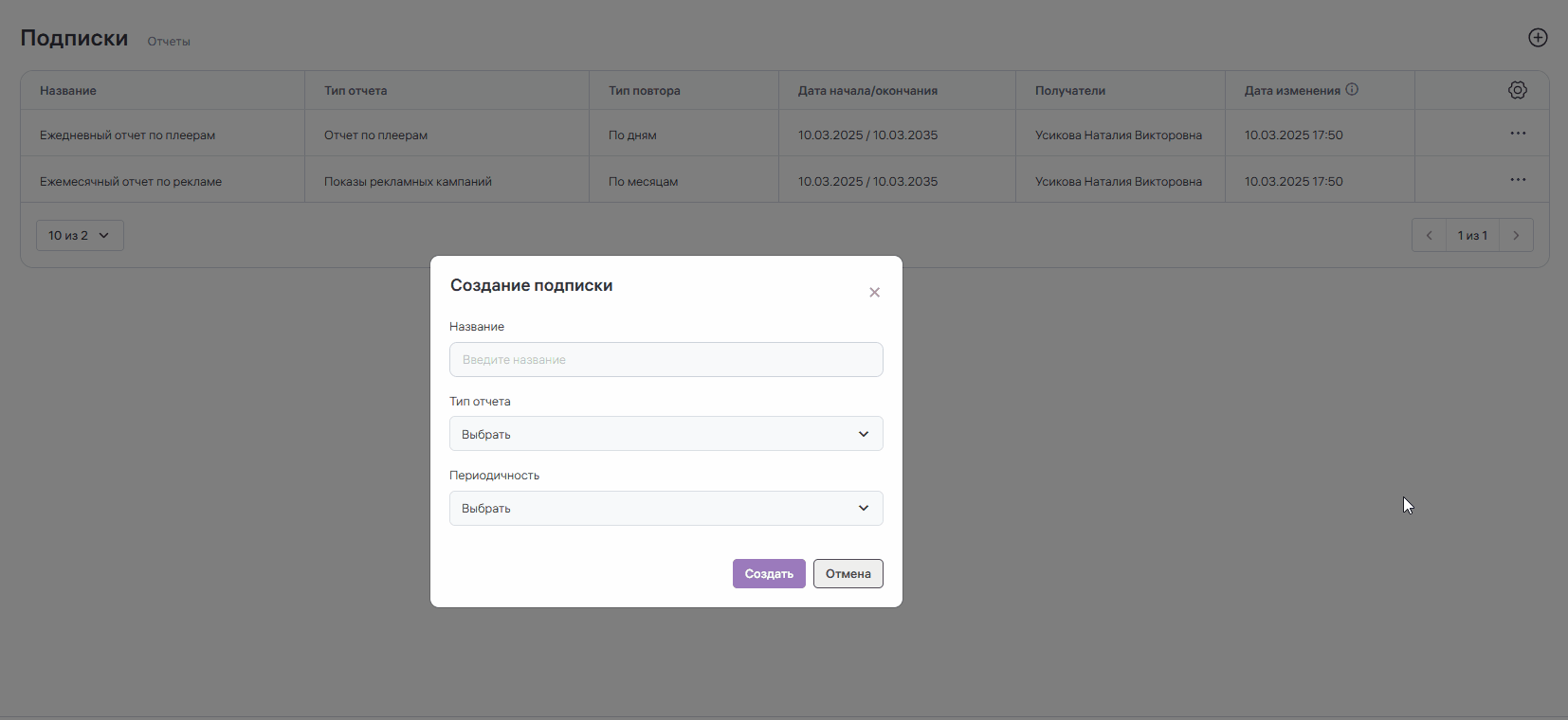 Регулярные отчеты помогают вам всегда быть в курсе всех ключевых показателей ваших публикаций, рекламных кампаний, опросов, состояния плееров и другой важной информации. Вы можете настроить регулярное формирование отчетов для себя или другого пользователя и отправку полученных данных на электронную почту. Чтобы приступить к настройке, зайдите в раздел «Отчеты» и выберите пункт «Подписки». Откроется страница со списком всех созданных подписок. Здесь вы можете создать новую или изменить имеющуюся подписку. Если вы создаете подписку впервые, то список будет пустым. Нажмите на кнопку создания новой подписки ![](attachments/image_1.jpg) Появится окно добавления подписки. ![](attachments/image_12.gif)