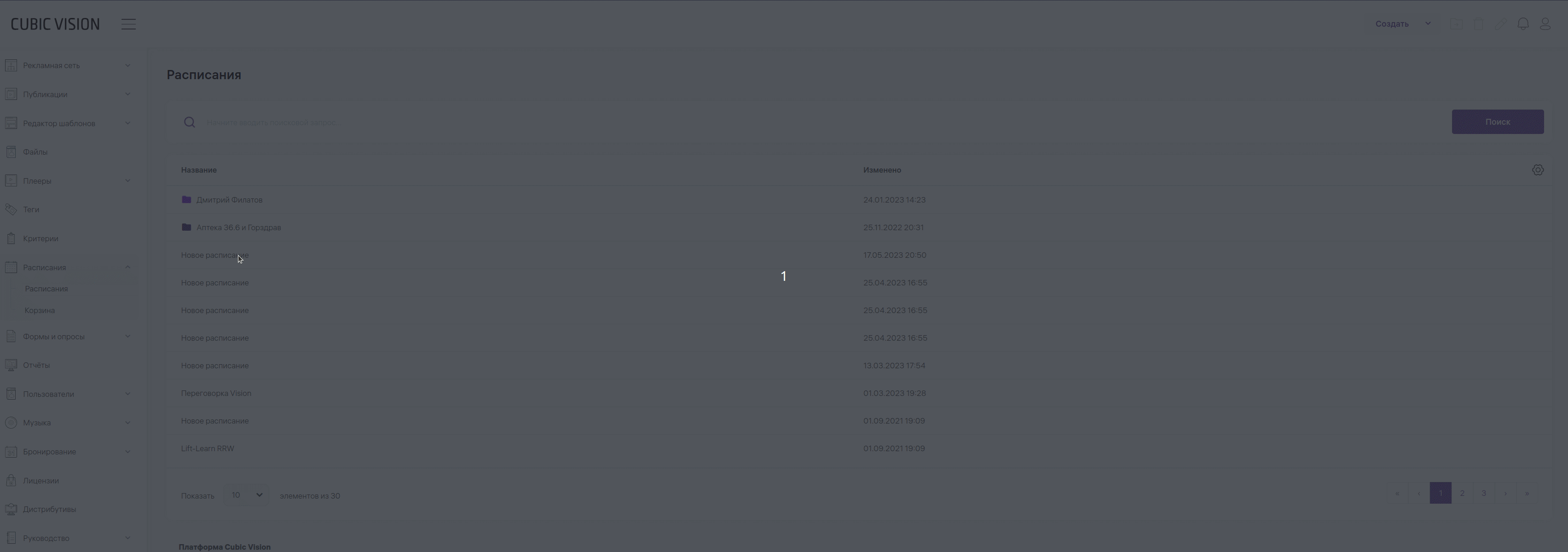 Зайдите в раздел «Расписания» главного меню и выберите пункт «Расписания». Откроется окно, в котором вы увидите поле для поиска расписания, список созданных расписаний и блок кнопок. ![](attachments/image_1.gif)