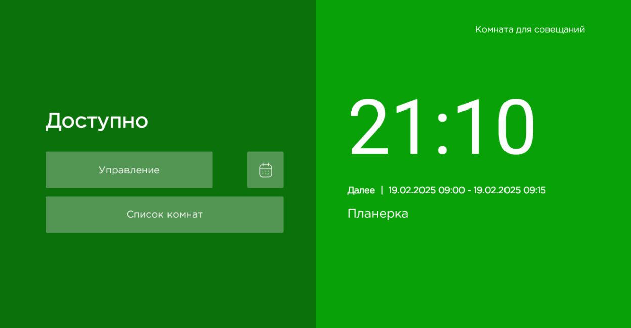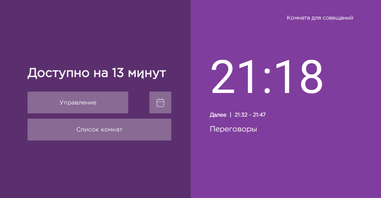 За 15 минут до начала новой встречи форма становится желтого (или другого, настроенного в виджете) цвета. Появляется надпись с информацией о времени, на которое можно забронировать комнату. При нажатии на кнопку ![](attachments/image_1.jpg) вы можете просмотреть составленное расписание встреч в календаре. ![](attachments/image_4.gif)