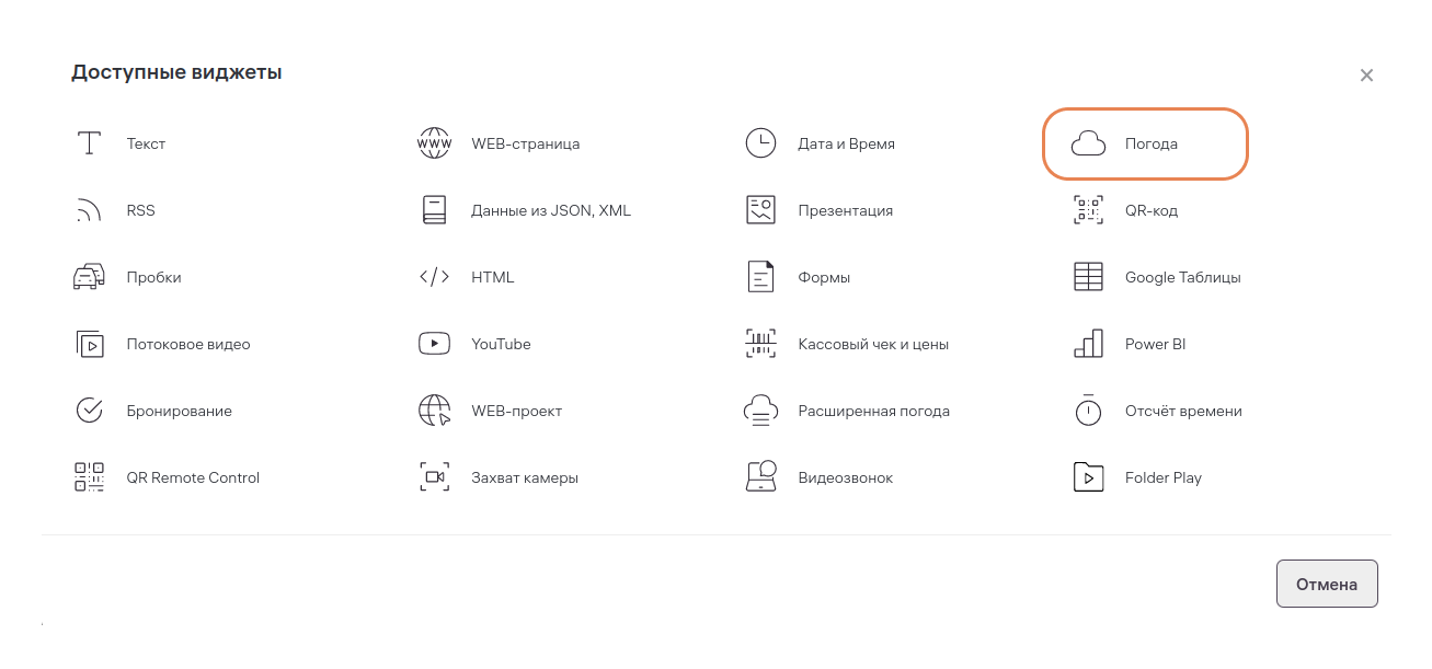 3. Во вкладке «Контент» в настройках сцены или контейнера нажмите на кнопку «Добавить виджет». Откроется окно со списком доступных виджетов. Выберите виджет «Погода». Откроется окно с настройками виджета.