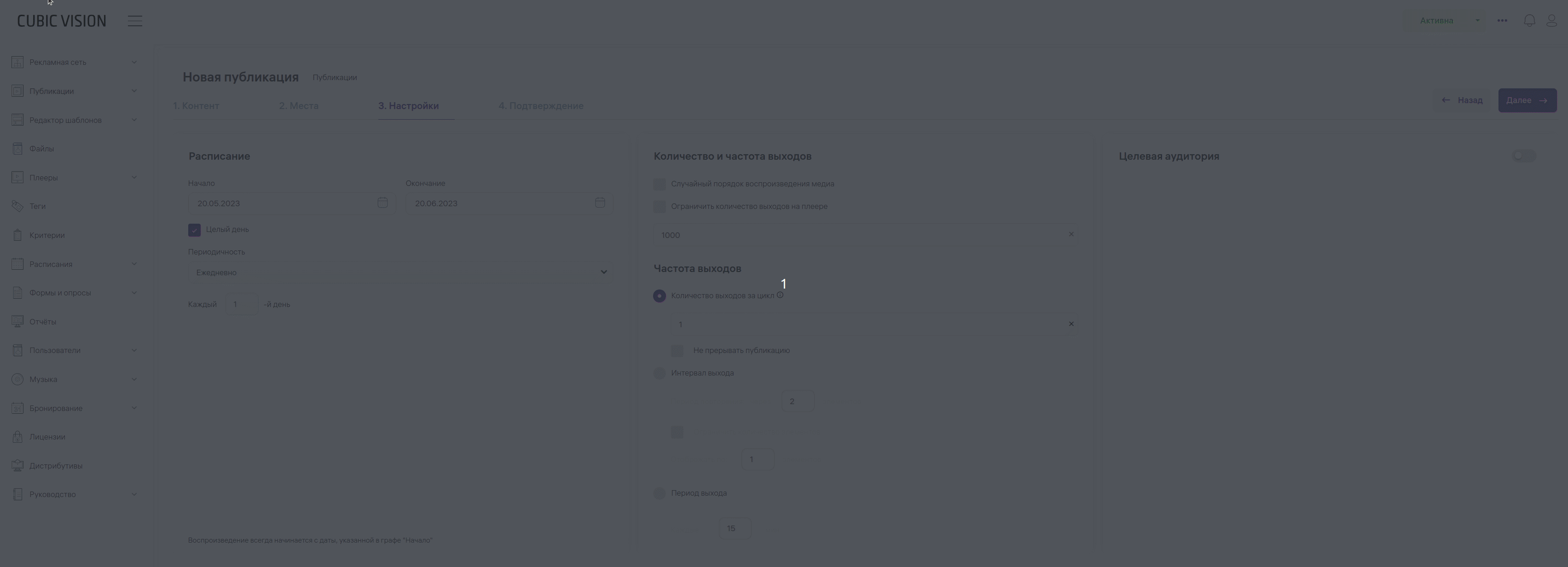 В данной вкладке можно настроить частоту выхода публикации и целевую аудиторию Войдите в раздел «Настройки». Откроется окно для настройки расписания, частоты выхода публикации и целевой аудитории. Выберите нужные вам настройки. Вы можете выбрать дату начала и окончания публикации. Например, 22.04.2023 года — публикация начнет демонстрироваться, а 22.05.23 — закончит. Поставьте отметку в чекбоксе «Целый день», чтобы публикация демонстрировалась весь день. Если отметку не ставить, появится возможность выбрать один или несколько временных интервалов.