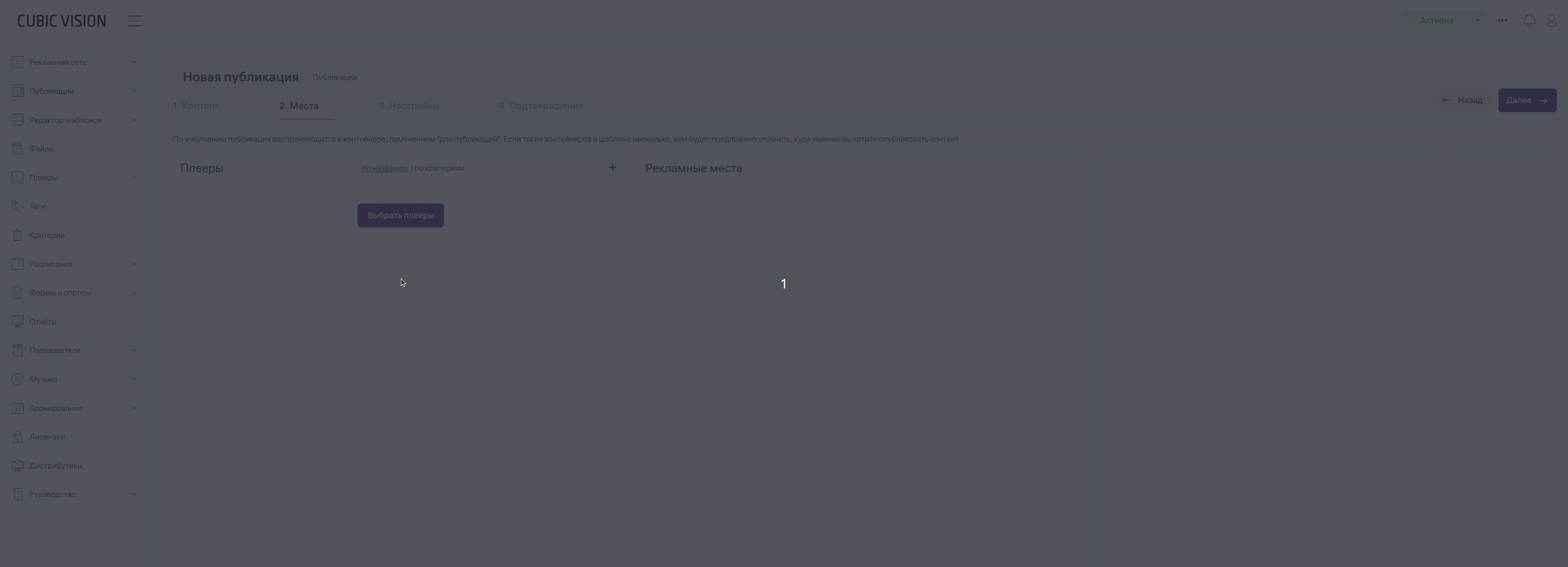 В разделе «Рекламные места» появится название рекламного места, которое вы должны были задать в шаблоне. Если названия нет, зайдите в шаблон, в нем выберите сцену или контейнер. Затем зайдите в настройки в правом меню и поставьте отметку в чекбоксе «Размещение публикации», а в поле «Название рекламного места» — введите название. Любая сцена и любой контейнер могут стать рекламным местом. Вы можете выбрать одно или несколько рекламных мест. Например, на одной сцене вы разметили два контейнера — они оба могут стать рекламными местами, если в их настройках стоит отметка «Размещение публикации». ![](attachments/image_8.gif)
