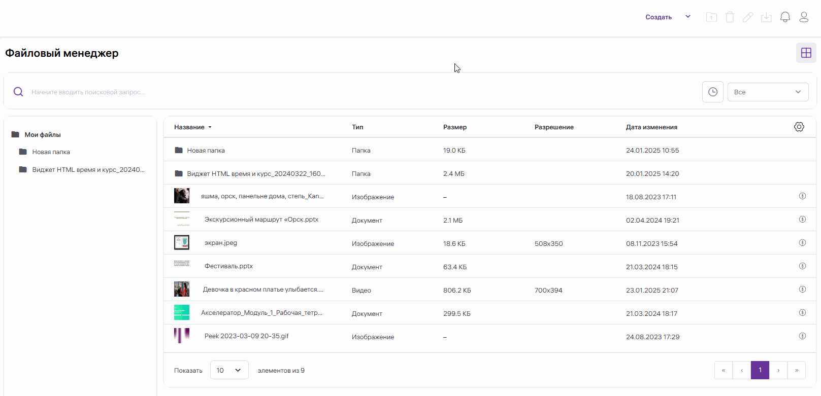 1. Для добавления нового файла выберите в каталоге папку, в которую будет добавлен новый файл, нажмите на кнопку «Создать» и выберите «Загрузить файл».